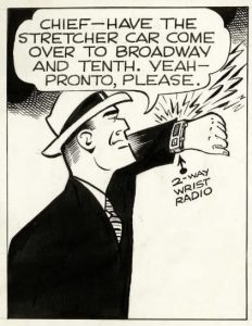 OK, so I mentioned the walkie talkie. Here’s something else that was part of the culture of that era: the Dick Tracy newspaper comic strip. Featuring tough and smart police detective Dick Tracy, the strip debuted in 1931 and, importantly, in 1946 Dick Tracy got a new tool to help him in his job: “the 2-Way Wrist Radio”, which became an iconic part of the strip, carefully called out many times by artist Chester Gould until …it turned into “the 2-Way Wrist TV” in 1964.