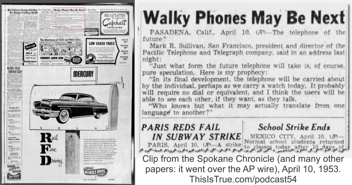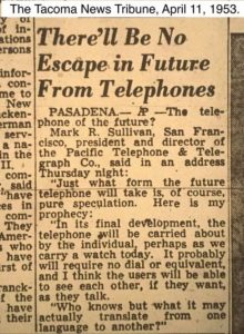 The article, in which the Associated Press wondered might describe “the telephone of the future,” quotes Mark R. Sullivan of San Francisco, California. He was the president of Pacific Telephone at the time. The article says he gave a speech the night before — but didn’t say where, other than Pasadena, near Los Angeles, or who he was speaking to — and quoted several sentences from his talk. And I’ll read Sullivan’s remarks verbatim: