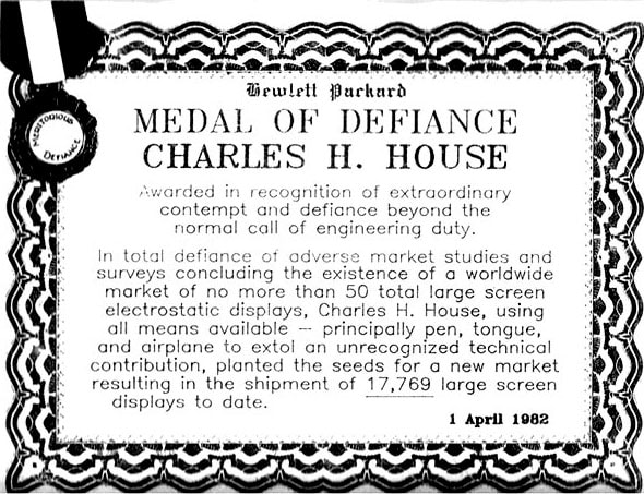 David Packard wasn’t a sore loser: he understood that House’s defiance was responsible for a lot of sales. So he awarded House a “medal of defiance,” to recognize his “extraordinary contempt and defiance beyond the normal call of engineering duty.”