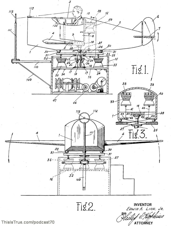 To help pay costs, Link would take just about any job he could find that would let him fly: he’d accept charter flights, and became a flight instructor himself, no doubt letting the students touch the controls. And that showed him why it was so expensive to learn to fly. Link, a lover of flying, with a background in how complicated mechanics worked, decided to come up with a way to teach new pilots to fly for a much lower cost.