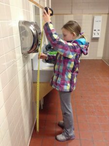 Nora, by then in 5th grade, used her meter at every hand blower she could find — dozens of them in schools, libraries, restaurants, and shopping malls. Her parents supported her efforts, driving her around to find more hand driers to test. She carefully measured how high on the wall each unit was, and made sure she did the sound measurement from the same distance each time. She repeated the sound measurement 20 times on each model to ensure she got a good average.