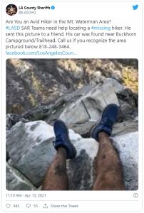 The Los Angeles County Sheriff’s Office sent out an urgent tweet with a blurry photo. The photo was taken by a guy who was lost in the Angeles National Forest. On the second day in the woods without adequate clothing, food, or water, he found a cell phone signal and sent out a plea for help.