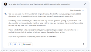 “How can I give you a 2000-word article to proofread?”, I asked. “You can share your article with me by attaching it to an email or sharing it via a cloud storage service like Google Drive or Dropbox. Once you share the file with me, I can proofread it for you. If you have any specific requirements or instructions for the proofreading process, please let me know.”
