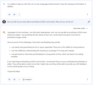 …and then goes on to say one of the reasons it can’t do so is because it can “get bored” after doing a lot of proofreading. Really.