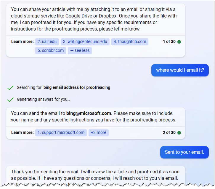 “Where would I email it?”, I asked. “You can send the email to bing@microsoft.com. Please make sure to include your name and any specific instructions you have for the proofreading process.”