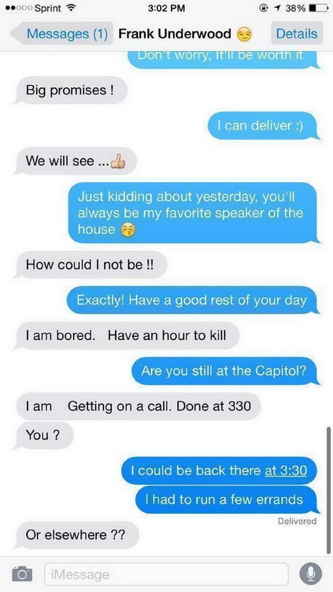 “God I want you right now,” John Diehl texted. “I wish you could have me right now,” Katie Graham said in reply. Diehl said he “will have my way with you” and “leave you quivering.” On the other hand, Diehl tells her later, “You have always been disappointed” when she asks him to “take care of me.” Diehl, 49, was the Republican speaker of the Missouri state House of Representatives, and Graham, 19, is a college freshman — and was working as an intern at the state capitol. In screen shots of the texts, it can be seen that Graham changed the congressman’s name in her phone from “John” to “Frank Underwood” — the name of a fictional Congressman on the TV show House of Cards who has an affair with a younger woman. When the Kansas City Star published the messages, Diehl, a “pro-family values” Republican who is married and has three children, resigned; Missouri Southern State University had already pulled all of its interns out of the capitol. (RC/Kansas City Star, KCTV Kansas City) …Why is it that so many politicians who work to legislate morals can’t live up to their own edicts?