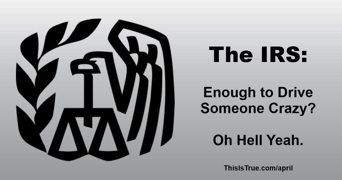 Black IRS eagle logo on a gray background with text: The IRS: Enough to Drive Someone Crazy? Oh Hell Yeah. and a website link at the bottom.I’m a word guy — I can blast out an essay like this in about half an hour (which is, in fact, about how long it took me to write this). But taxes? Hey, I’m even decent at numbers: I can estimate easily. What’s 20% off on a $15 item? Well, 10% is $1.50 — just move the decimal point over. Double that is $3, so the discounted price is $12. Easy.