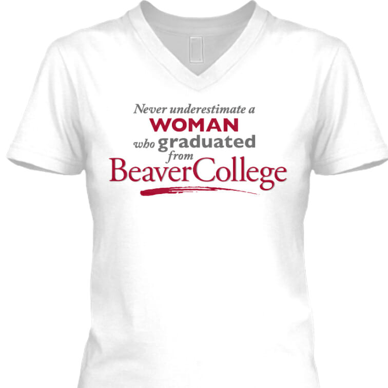 White V-neck T-shirt with the text: Never underestimate a WOMAN who graduated from Beaver College in black, red, and gray lettering.
