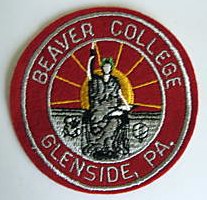 A circular patch with a red border reads Beaver College, Glenside, PA. It features an embroidered image of a seated figure with an arm raised, with a yellow sunburst and water in the background.