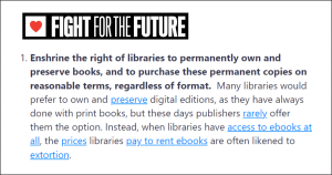 The non-profit “Fight for the Future” — formed in 2012 to lead the successful fight against the “Stop Online Piracy Act” (SOPA) and the “PROTECT IP Act” (PIPA) — has turned to protecting libraries from giant publishers who are trying to take away the right to loan books, particularly now that most books are published as ebooks.