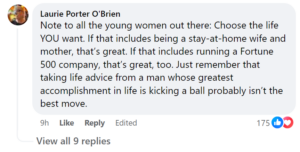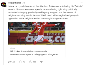 And all through those posts and the comments below it, there is a thread of ad hominem against Butker, as if demeaning him “taking advice from a person who kicks a ball. . .” wins the argument. And you did a bit of that yourself. Reminder, attack the position, not the person, if you are trying to make valid points.