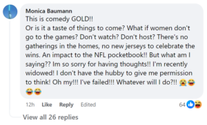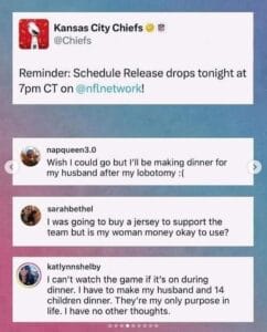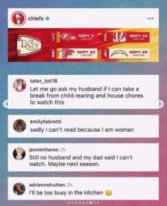 Ya think maybe the franchise is losing a lot of their fans? The NFL did release a written statement: “His views are not those of the NFL as an organization,” they said. “The NFL is steadfast in our commitment to inclusion, which only makes our league stronger.” It was written by NFL Senior Vice President Jonathan Beane, who also serves as the league’s Chief Diversity and Inclusion Officer. My take: that’s a very careful way of saying Butker is making the NFL look weak, as is well reflected in the above comments from (mostly) women who are football fans.