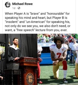 While I am a big supporter of Colin Kaepernick’s mission and do not agree with how he was treated by the NFL, he did choose to protest at ‘work’ during ‘work time’. I have engaged in protest at work and was prepared to be fired for it. At the same time, I disagree strongly with the sentiments expressed by Harrison Butker and with the christian nationalism that is behind them. However, he was invited to share his thoughts and while I do not know the details in this instance, commencement speakers are not usually asked to vet their speeches beforehand.