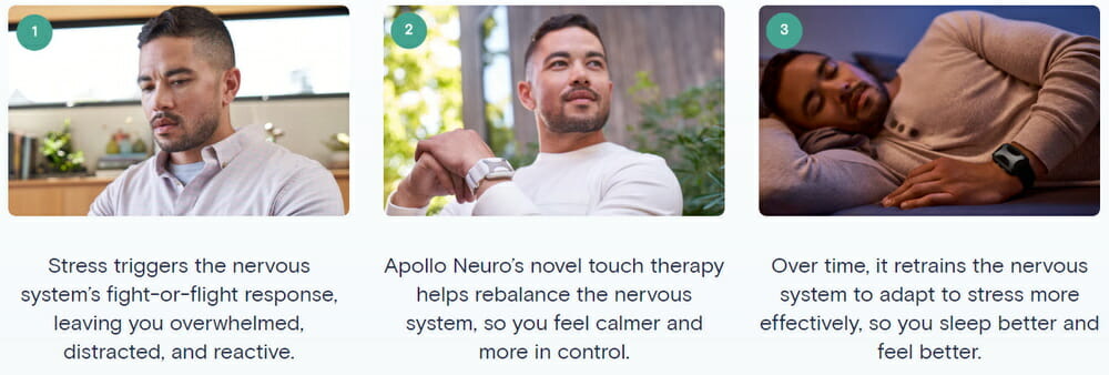 “When we encounter stress in our environment, our heart rate, respiratory rate, and blood pressure should go up so we can quickly respond to a threat. When we’re calm, our heart rate, respiratory rate, and blood pressure should be at comfortable resting rate. This is our body’s way of maintaining balance between thriving and surviving over time.” … “HRV is the most reliable, non-invasive biometric of stress, measuring the balance between the parasympathetic and sympathetic systems.” (Apollo’s science page, references omitted.)