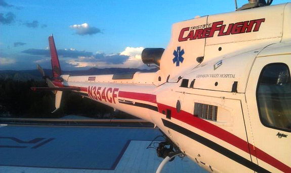 At the county line, we are only about 12 minutes from the closest hospital, the same hospital where the chopper parks. So why did we need a helicopter for such a short trip? That hospital is a small one: they have no neurologist to handle head injuries. The closest hospital with a neurologist is 65 miles beyond, in Grand Junction.