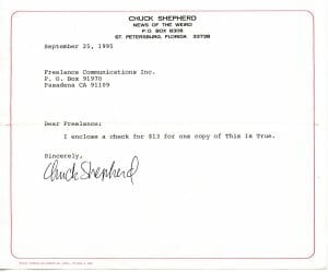Saddened to hear of Chuck’s demise, I first met him at the University of South Florida’s Florida Suncoast Writers Conference in 1992, I believe. Afterward, we kept in touch occasionally, which led to the biggest impact I had on him: I was responsible for his very first TV show appearance in the mid-1990s. Only public access, and due to his relatively weird schedule (Remember the days when weird news stories mostly broke during the wee hours, and Chuck usually slept days) he was fighting sleep the entire time, but it was a milestone!
