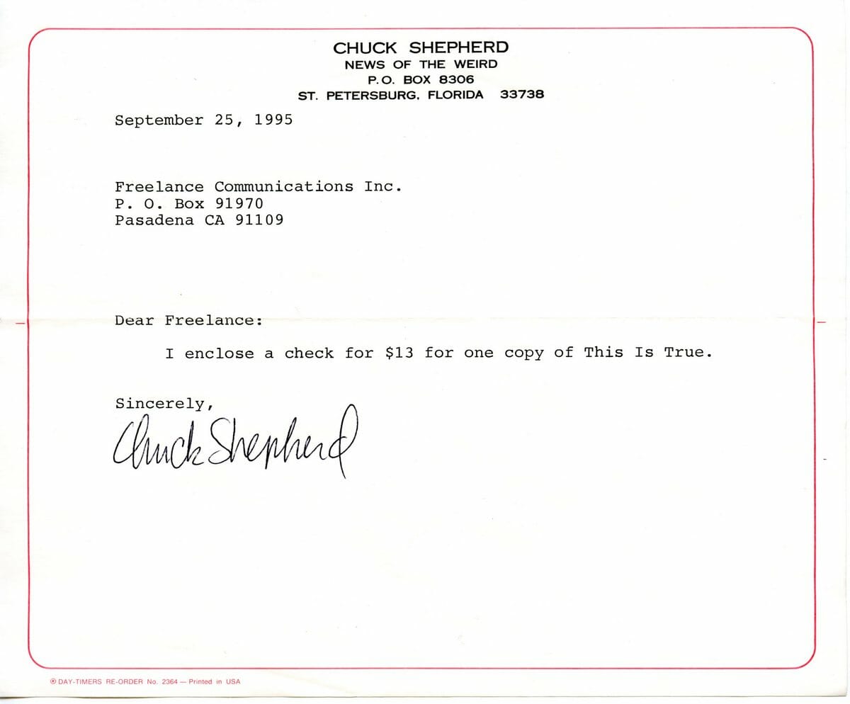 I lost touch w/ Chuck as the years went by and life happened. I was very glad to find “This is True” — a worthy replacement for News of the Weird. I pray that you keep it going for many, many years. It is like an addiction and I wouldn’t want to be without the “news” of the strange things people do and say.