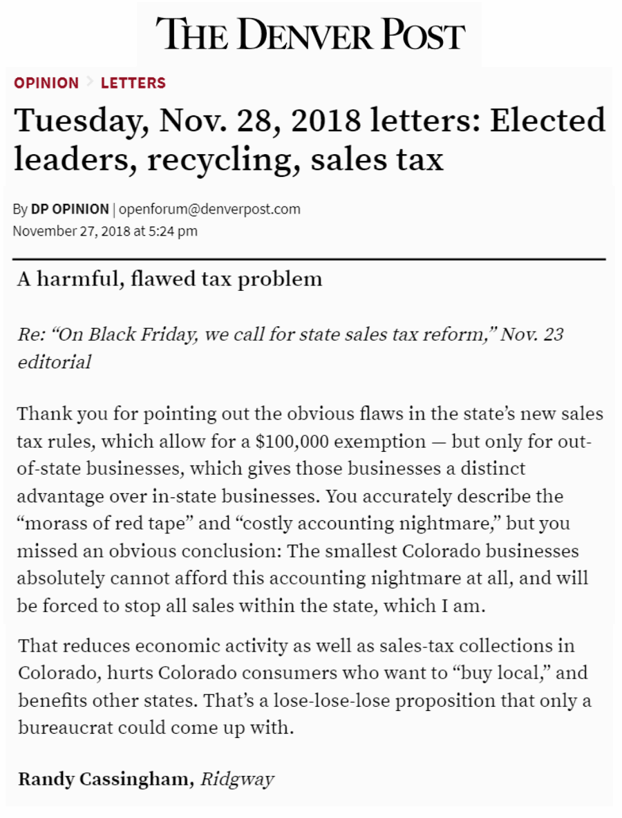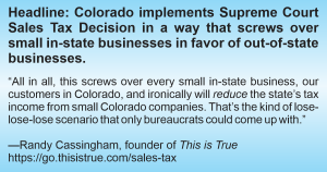 Absolutely true, but they miss the much-more-obvious alternative that the smallest businesses will choose — what it’s coming down to for us: many small businesses will shut down sales to Coloradans, and stop the small amount of sales we used to collect for the state multiplied by every company in this position, rather than subject ourselves to this “costly accounting nightmare.”