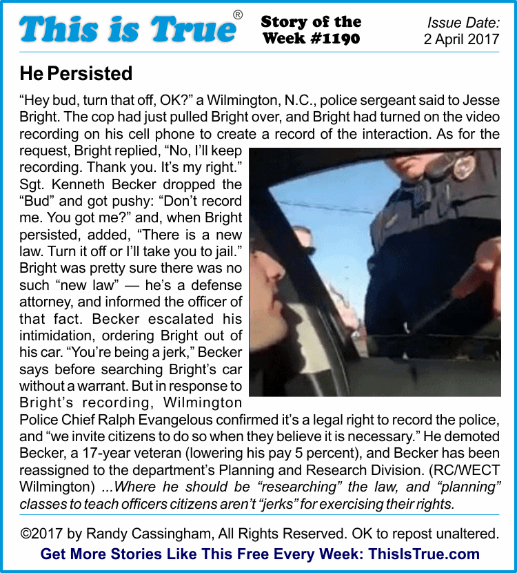 The Times story notes that the 7th Circuit Court of Appeals, which has jurisdiction over Illinois, Indiana and Wisconsin, had struck down an Illinois law prohibiting people from making recordings of police officers in May 2012. There are many other such federal cases affirming the right, as well as many cases such as those reported above of officers harassing citizens for exercising that right. When “the man” with a badge and a gun trespasses and deny citizens’ rights there, inside the citizen’s own home, something is definitely very wrong.