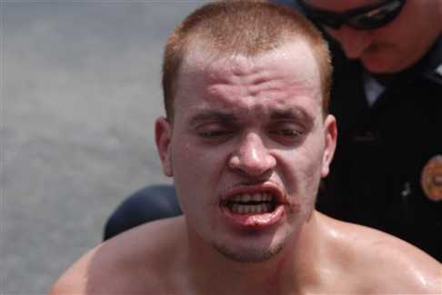 A shirtless man with short hair and a bruised, swollen lip grimaces while a police officer stands behind him. The scene appears to be outdoors in daylight.
