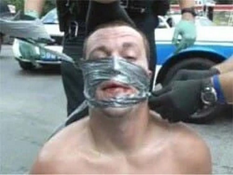 A man appears to be kneeling on the ground, not wearing a shirt, with his face partially wrapped in duct tape. A police officer with gloved hands is unwrapping the tape.