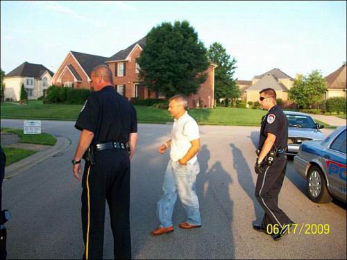 The real question is: Where the heck is this 4th officer in the picture the caption is talking about? I only see 2 cops, a drunk dude, and the shadow of the photographer (presumably also a cop).