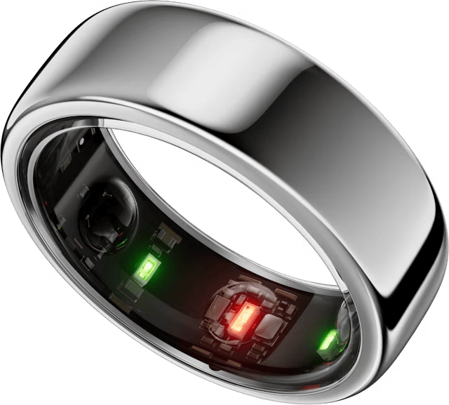 An Oura Ring showing its “medical grade sensors.” This isn’t an illustration: it’s what I see when I take my ring off and look inside. The outside shell is titanium; it’s definitely not cheap plastic crap. (OuraRing.com)