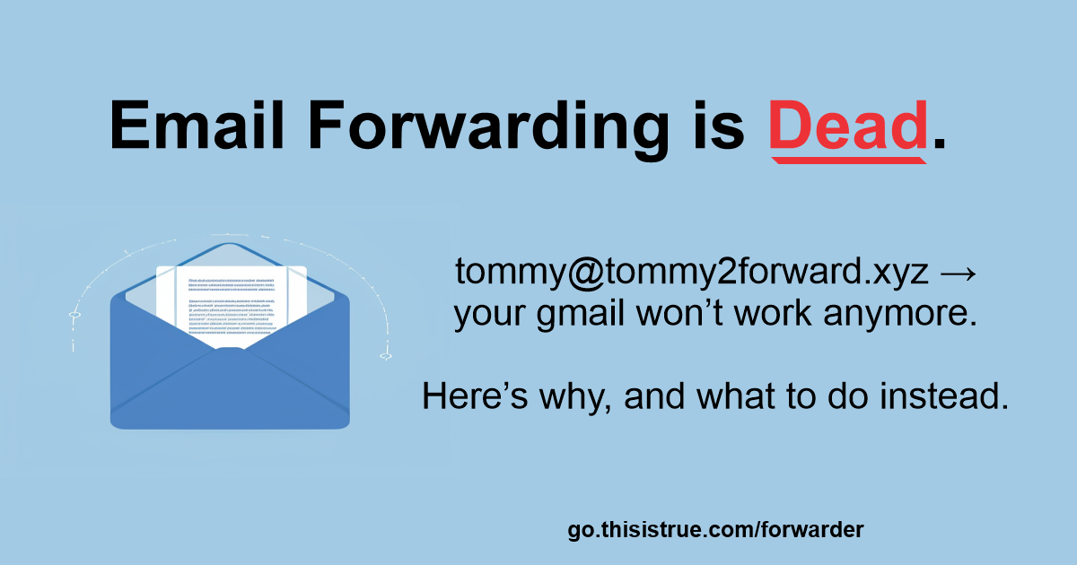 OK, so you sign up to get mail from True and put in your forwarding address, tommy [at] tommy2forward.xyz, which automatically forwards the newsletter to your real mailbox at GMail. Then a newsletter comes out, bounces through your forwarder, and arrives at your GMail mailbox, which looks at it: it says it’s “from” thisistrue.com, it checks to see what servers are allowed to send mail for thisistrue.com, and it makes a discovery: