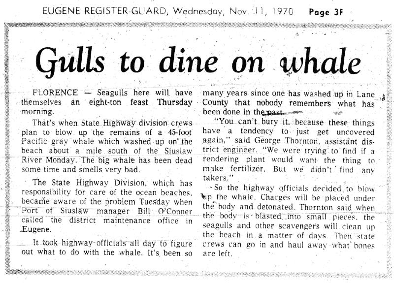 Why there were so many people there to watch: the Eugene Register-Guard gave a day’s notice. Who could resist? They later published errata noting it was a sperm whale, not a gray, which don’t have teeth.