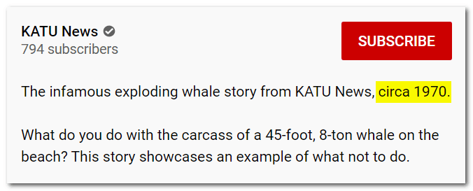 One thing that amuses me: KATU didn’t post the video online until 2019, on the 49th anniversary of the classic tale. Yet even then,  the video quality was poor, and the posting caption notes it is, “The infamous exploding whale story from KATU News, circa 1970.”