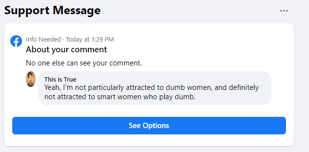 25. In a sense you did violate the policy against putting down groups of people. You implied that dumb women, and worse yet, smart women who pretend they are dumb, are not as good as smart women generally. While I agree with you completely from the perspective of overview, they are correct on technicality. When or if your comments were reviewed by a human you received the same kind of assessment that has become so common from Facebook and other social media platforms in their ongoing efforts to guarantee that only things they agree with will be discussed.