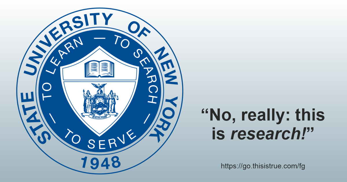 The State University of New York seal with the motto “To Learn, To Search, To Serve,” next to the text: “No, really: this is research!” and a website link to this page.The alternative tag that popped out of my mouth that really made us both roll on the floor laughing was: “…Coming soon from the makers of Squirt….” (Don’t I just have the coolest wife?!)