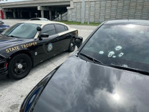 I also like how this makes it clear that Mazzetta isn’t leaning out the window to shoot, he’s rather shooting through his own windshield, which resulted in him and his passenger getting sprayed with pieces of glass. A later view toward the front shows damage to the glass: see below for the news report from WESH Orlando.