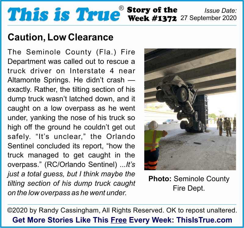 More because it was accidental, but less because shouldn’t a professional truck driver 1) know how to secure his vehicle properly, and 2) grasp that the “Bridge Clearance” sign applies to him? Well, apparently not in this case.