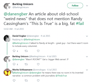 The reporter, Daniel Engber, certainly knows about This is True — he wrote me in December: “I’m researching a story for Pacific Standard Magazine on the history and evolution of ‘weird news,’” he said, “so naturally I’d love to talk to you.” I spent an hour or two with him. I just didn’t know he meant he needed me as an unpaid researcher. He promised he’d send me the URL of the article when it was published; he didn’t.