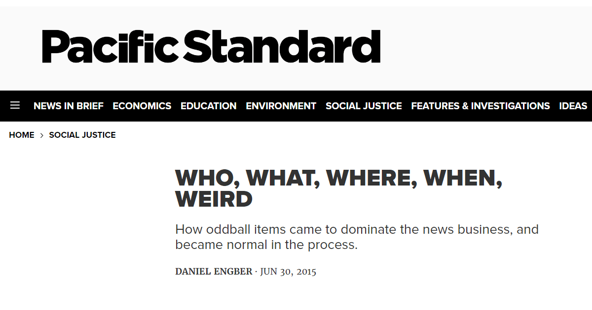 I really had to roll my eyes this weekend when a reader sent me the URL to an article from the July/August issue of the in-print (and, obviously, online) Pacific Standard magazine: “Who, What, Where, When, Weird — How oddball items came to dominate the news business, and became normal in the process.” — billed as a history of “weird news” and where it’s going, what with that newfangled Internet thing and all.
