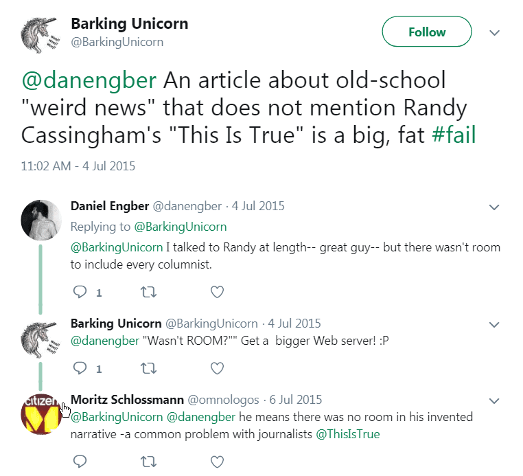 The reporter, Daniel Engber, certainly knows about This is True — he wrote me in December: “I’m researching a story for Pacific Standard Magazine on the history and evolution of ‘weird news,’” he said, “so naturally I’d love to talk to you.” I spent an hour or two with him. I just didn’t know he meant he needed me as an unpaid researcher. He promised he’d send me the URL of the article when it was published; he didn’t.