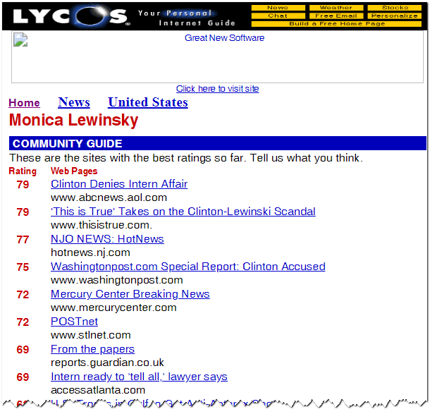 That was Monday, January 26, 1998. All week, stories dribbled out: Clinton’s use of weaselly words that cast doubt on his denial, rumors of a stained blue dress, and more.