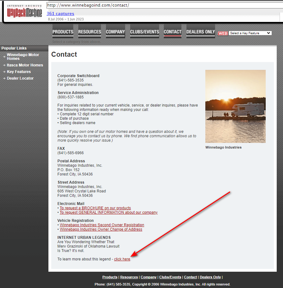 Screenshot of a contact page for Winnebago Industries with company contact details, links to brochures, registration, and FAQs. A red arrow points to a click here link for more information at the bottom.