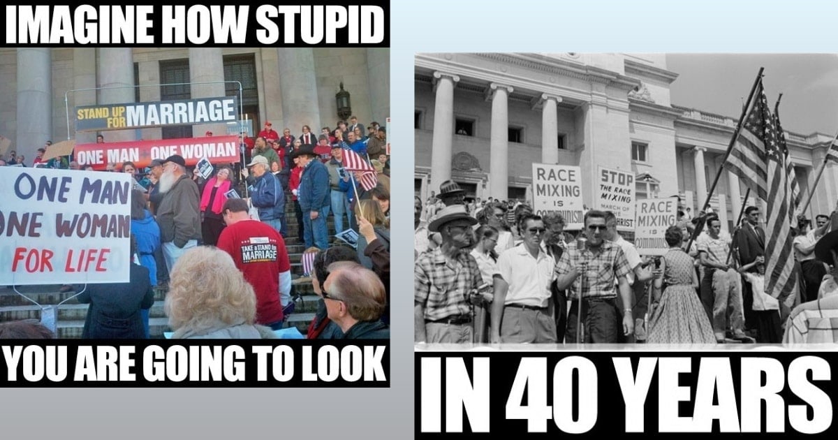 “Tradition!” many say. When I was a child, it was “tradition” to discriminate against those called “negroes” at that time. During my lifetime, dozens of states had laws prohibiting blacks and whites from marrying, too. It wasn’t until 1967 that the Supreme Court struck down “anti-miscegenation” laws. That instantly destroyed all marriages, right? Well, no, I didn’t see that happen either.