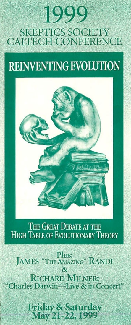 I have the delightful job of presenting Dumbth Award for the dumbest thing of 1998 (culled, of course, from True!) to warm up the crowd for the Keynote speaker. The theme this year: “Reinventing Evolution: The Great Debate at the High Table of Evolutionary Theory.”