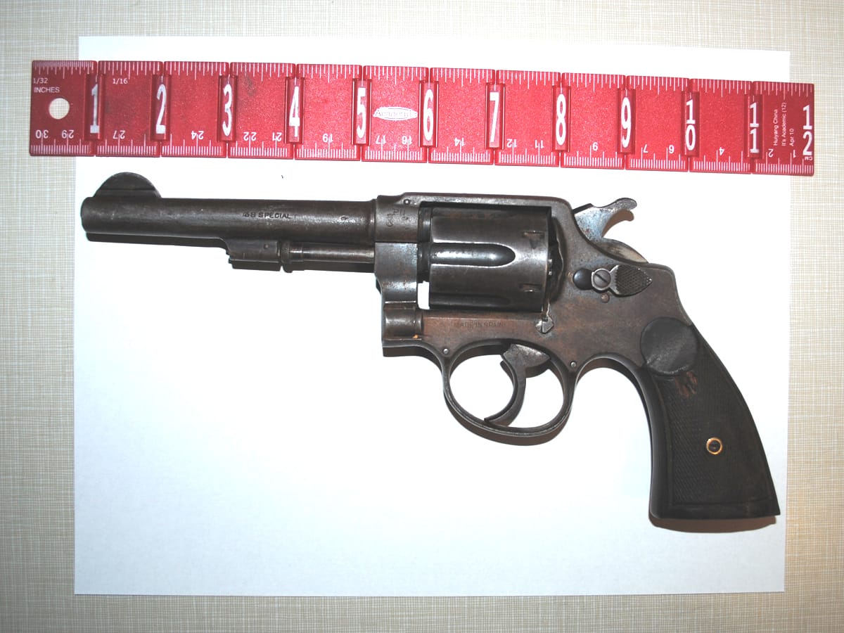 Got a holster for that? When I said it was a full-sized revolver, I meant it. Here’s a photo of it lying on an 8.5×11″ sheet of paper, with a ruler just to drive the point home (as it were). (Onslow County Sheriff’s Office)