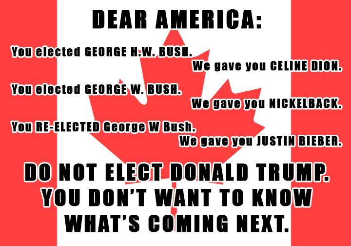 This weekend, I found and posted a meme of a Canadian flag that says, “Dear America: You elected George H.W. Bush. We gave you Celine Dion. You elected George W. Bush. We gave you Nickelback. You Re-Elected George W. Bush. We gave you Justin Bieber. DO NOT ELECT DONALD TRUMP. You don’t want to know what’s coming next.”