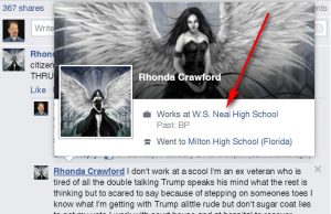 I posted a screen cap of her popup profile to show her that she had said herself that she worked at a school. “Face book did that because I would not put where I work down and there is two Rhonda Crawfords that live in brewton ala I guess that is what she does never looked at my personal page thanks for pointing that out”.