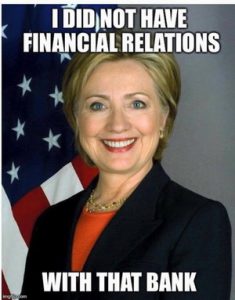 Don’t worry: the Democratic front-runner got her turn earlier. That meme shows Hillary with the large caption: “I DID NOT HAVE FINANCIAL RELATIONS … WITH THAT BANK.”