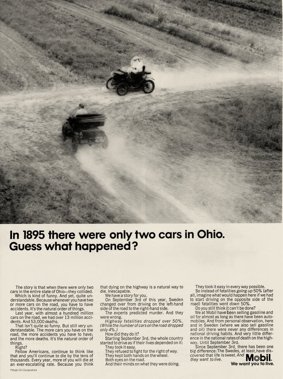 Like the “crash” ad, the headline is attention-grabbing, and it put Mobil into the public eye as a Big Corporation That Cares, which is a great idea for a company trying to sell a commodity product to a mass audience. It probably brought them many loyal customers.