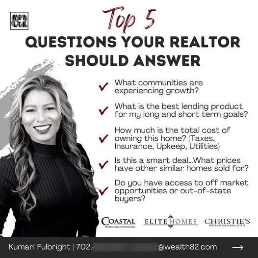 A smiling woman with long hair is on the left. On the right, text lists the 'Top 5 Questions Your Realtor Should Answer' with key real estate questions, alongside logos for Coastal, Elite Homes, and Christies International Real Estate.