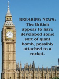 The absolute funniest one I’ve seen is this picture of London’s Big Ben, with the caption “BREAKING NEWS: The British appear to have developed some sort of giant bomb, possibly attached to a rocket.” Naturally I couldn’t find it now, so I went ahead and recreated it (click to see larger).
