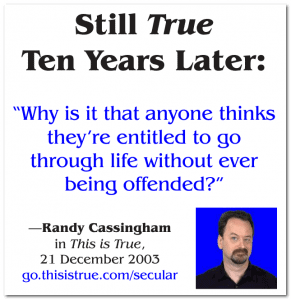 My first comment is in regard to a reply made by Randy to a commentator. The reply was, “May he someday understand true persecution. -rc”. To this I say, you cannot understand true persecution without experiencing it. Oh, you may have a sympathetic “understanding” of the mechanics, but you will never have the true, empathetic “understanding” without first hand experience as the target of said persecution. Be careful in what you wish upon others, as you may be wishing great pain and suffering upon another whose only offense is being “offended”.