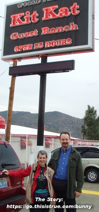We also stopped briefly at another brothel, the Kit Kat Guest Ranch, about a mile down the road. We pretty much had to, considering my wife’s name is Kit. Here we are posing out front.